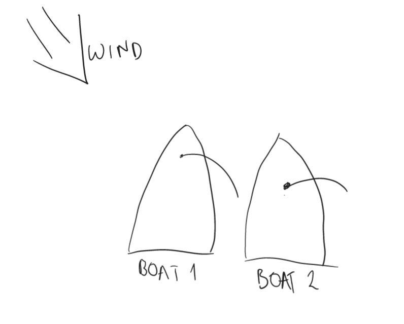 In this example, both boats are on the same (port) tack. Therefore, we must use the windward-leeward rule. As Boat 1 is closer to the wind, Boat 1 is the windward boat so Boat 2 has right of way.